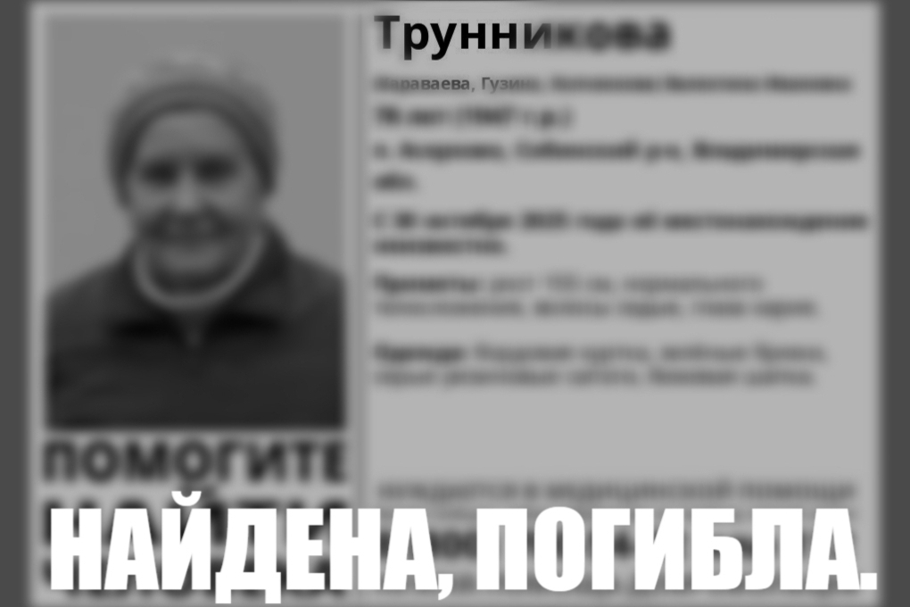 78-летняя женщина из поселка Асерхово Собинского района пропала 30 октября. Информации о нее местонахождении не было несколько дней. Все это время пенсионерку искали волонтеры. Надежда на благополучный исход поисков сохранялась до последнего.